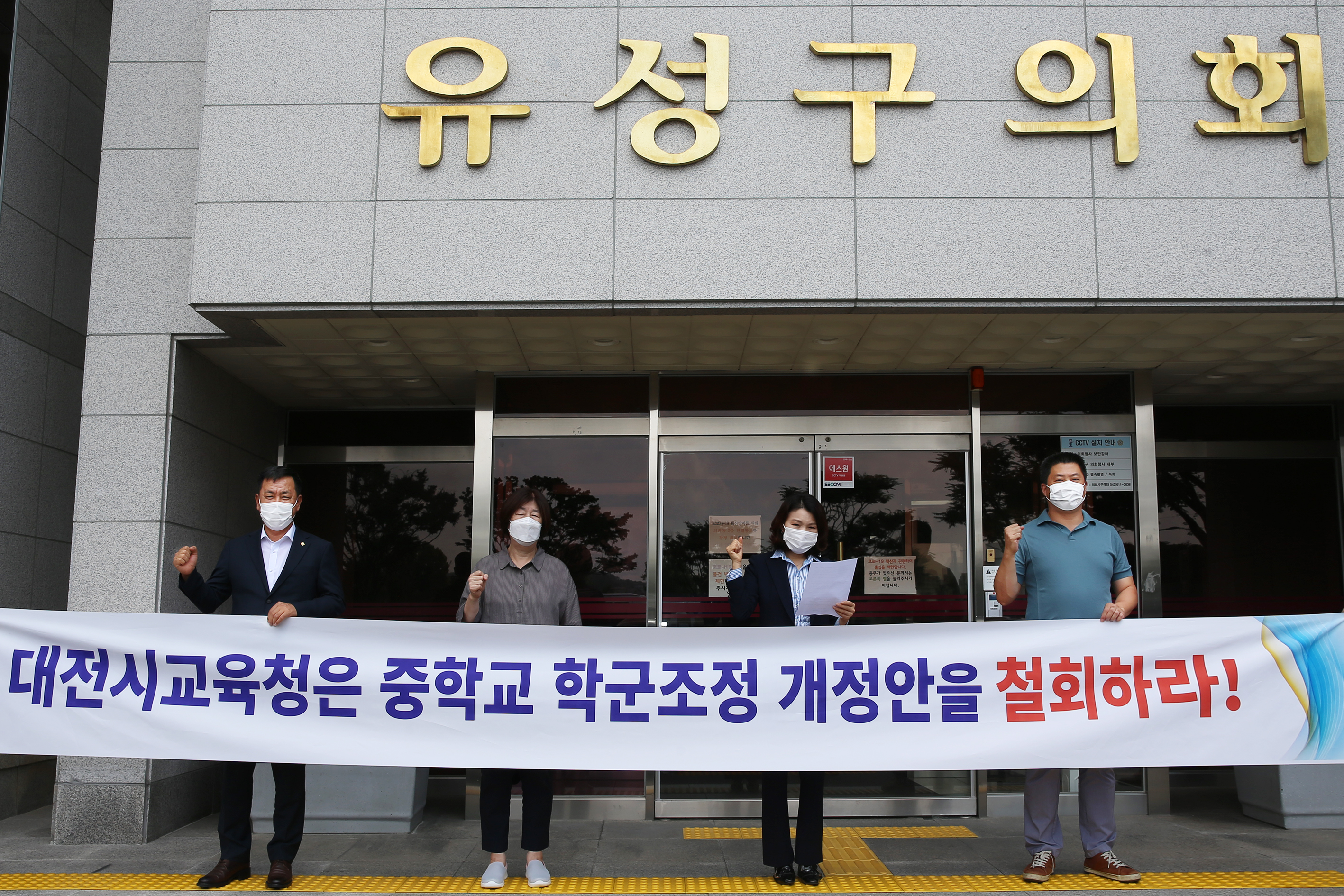 대전광역시 유성구의회(의장 이금선) 이금선,송재만,김연풍,하경옥 의원이 대전시교육청의 중학교 학군 배정 개정안에 대한 철회를 요구하는 성명서를 긴급 발표했다.