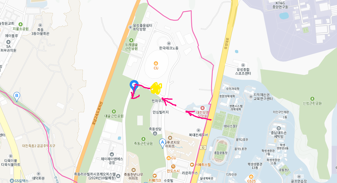 1. 죽동 한국타이어 테크노돔 950명 종사 2. 한화연구소 500명 근무 3. 인근 입주 연구소 600명 문제점: 출 퇴근시 30분간 도로정체 심각 개선안: 지하철 연계 마을버스 정류장을 설치해주시면 해결됩니다 효과: 대중교통 활성화 교통정체 해소 그림 첨부와 같이 노랑색 부분에 정류소 1개 설치하여 마을버스 지하철 연계만 시켜주면 많은 효과가 나타납니다 유성구 의회 이명숙 의원님 생활체육 육성에 노고가 많으십니다 늘 응원합니다. |